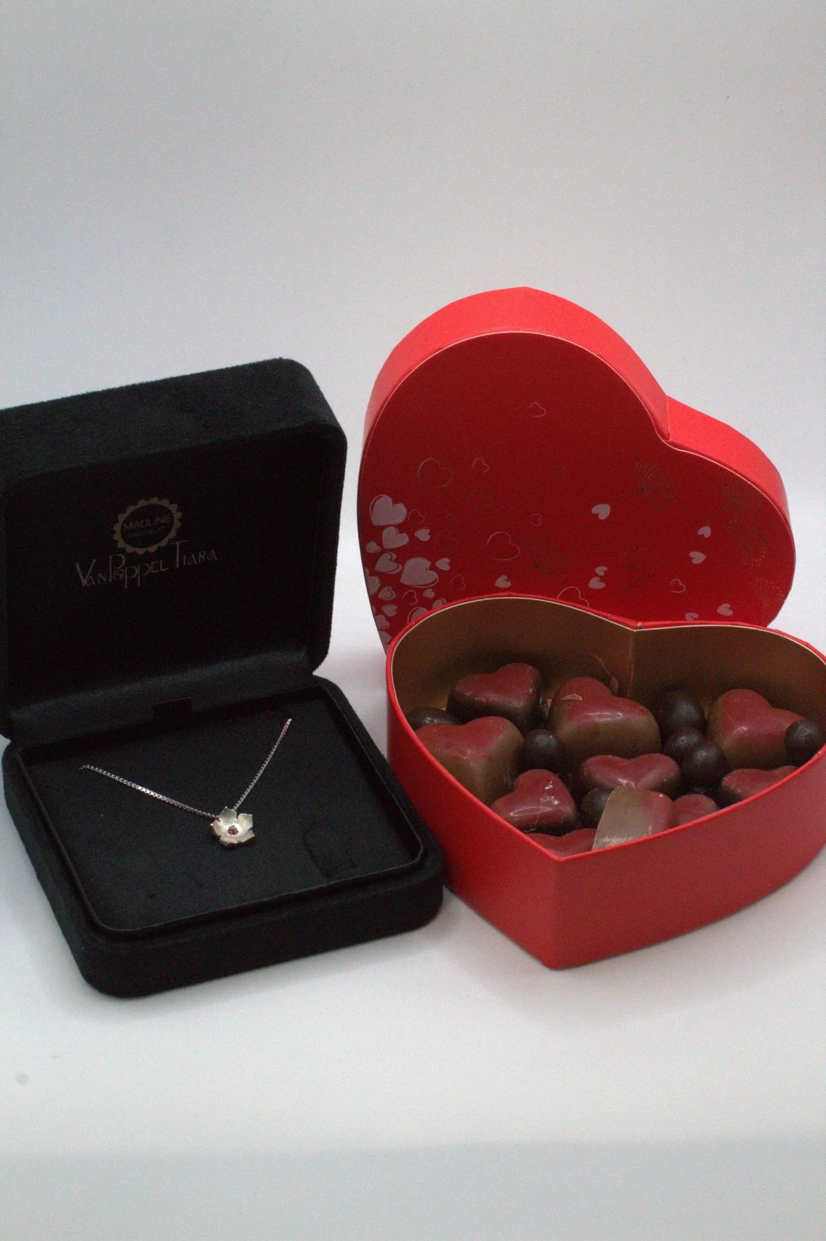 Découvrez le cadeau parfait de Saint-Valentin composé d’un collier artisanal en argent 925 (avec une pierre de grenat qui symbolise l’amour) et d’une boite de cœurs en chocolat réalisés avec passion.