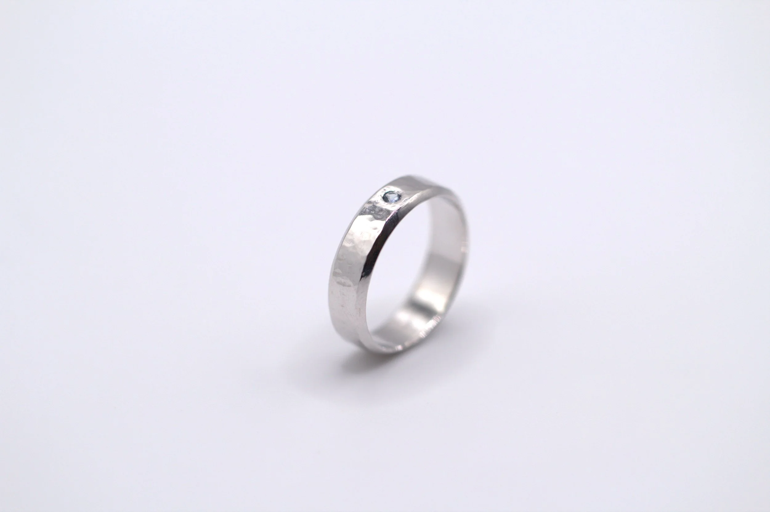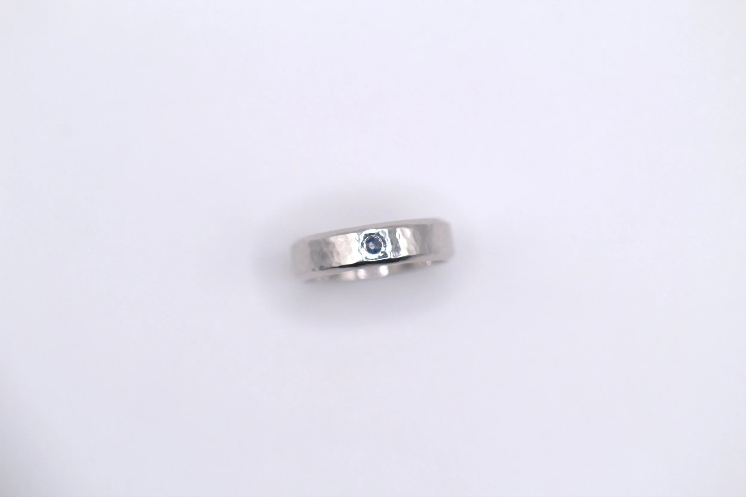 Or blanc 18 carats rhodié et martelé avec un saphir de 2mm taille brillant